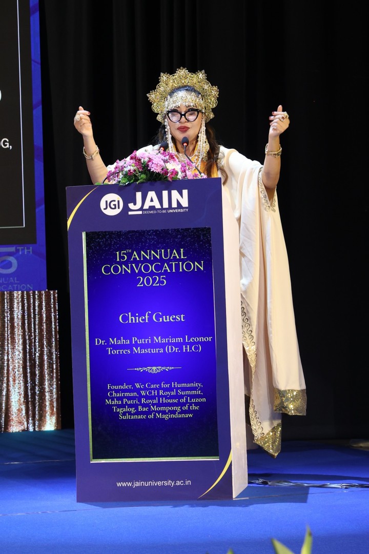 In a monumental celebration of academic excellence and global leadership, HRH Queen Mariam Leonor Torres Mastura, Founder and President of We Care for Humanity (WCH) and member of the Sultanate of Maguindanao, served as the Chief Guest at the 15th Convocation of JAIN (Deemed-to-be University) in Bangalore.