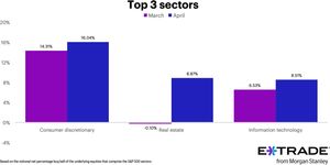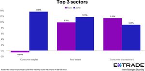 E*TRADE from Morgan Stanley today released the data from its monthly sector rotation study, which indicates whether clients were net buyers or sellers in each of the 11 core stock market sectors defined by the Global Industry Classification Standard (GICS). These figures, which encompass activity in all US-traded stocks (including OTC) and ADRs, reflect purchases and sales of the individual stocks in each sector, as well as dividend investments and options exercises and assignments.